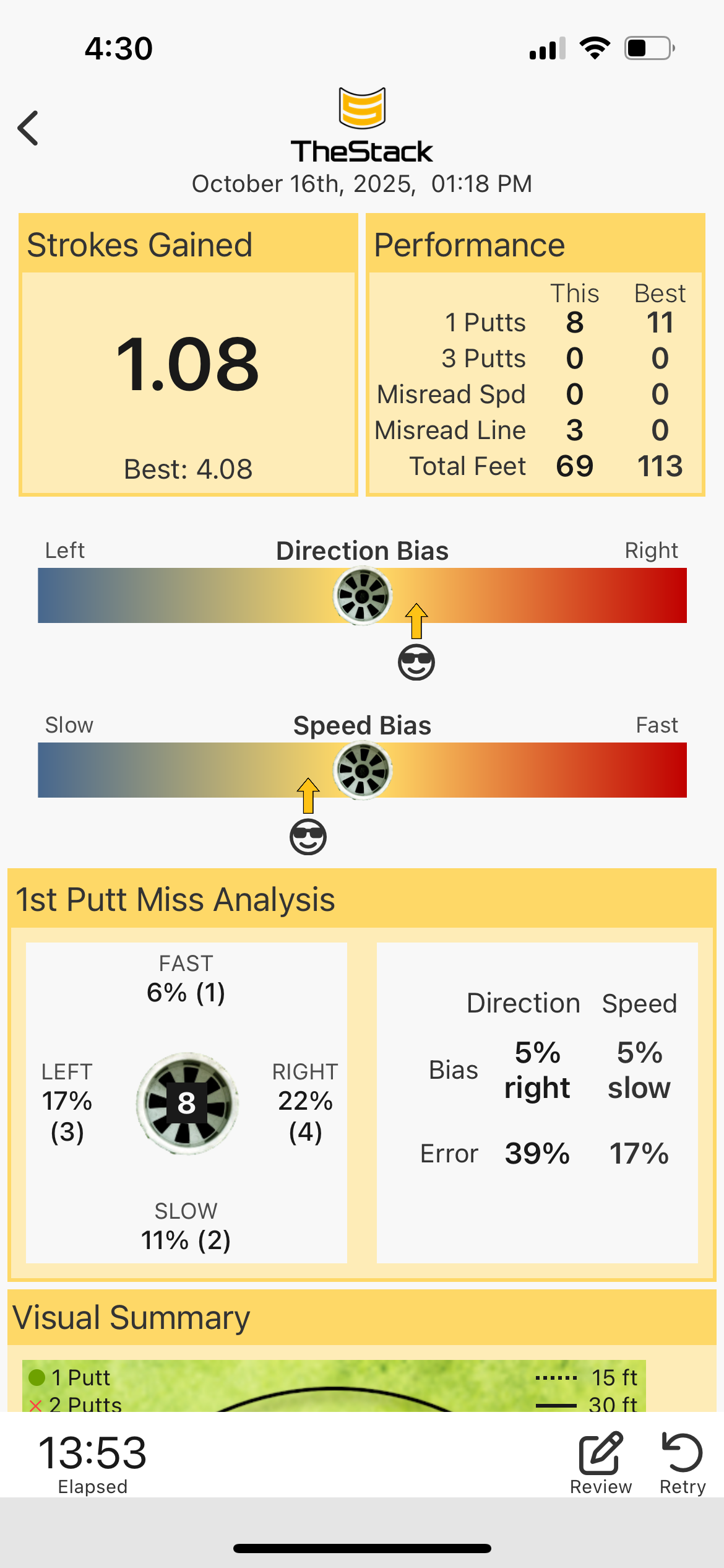 First crack at it today. Felt very weird. But the results were fine? Slightly worse than avg for me in the app. The misses were very good. Nothing more than 18 inches or so. I need to experiment a bit w looking at the hole, or a spot near it where I want to see the ball roll through into the hole