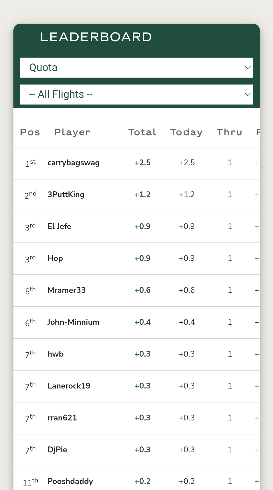 I might have had bad intel on the format when I made the first overall pick. I thought it was cumulative points not cumulative quota. @connor gonna need some birdies out of you big dog. Fly high Coach’s angels. May the fairways be open, the greens soft and the putts roll true.