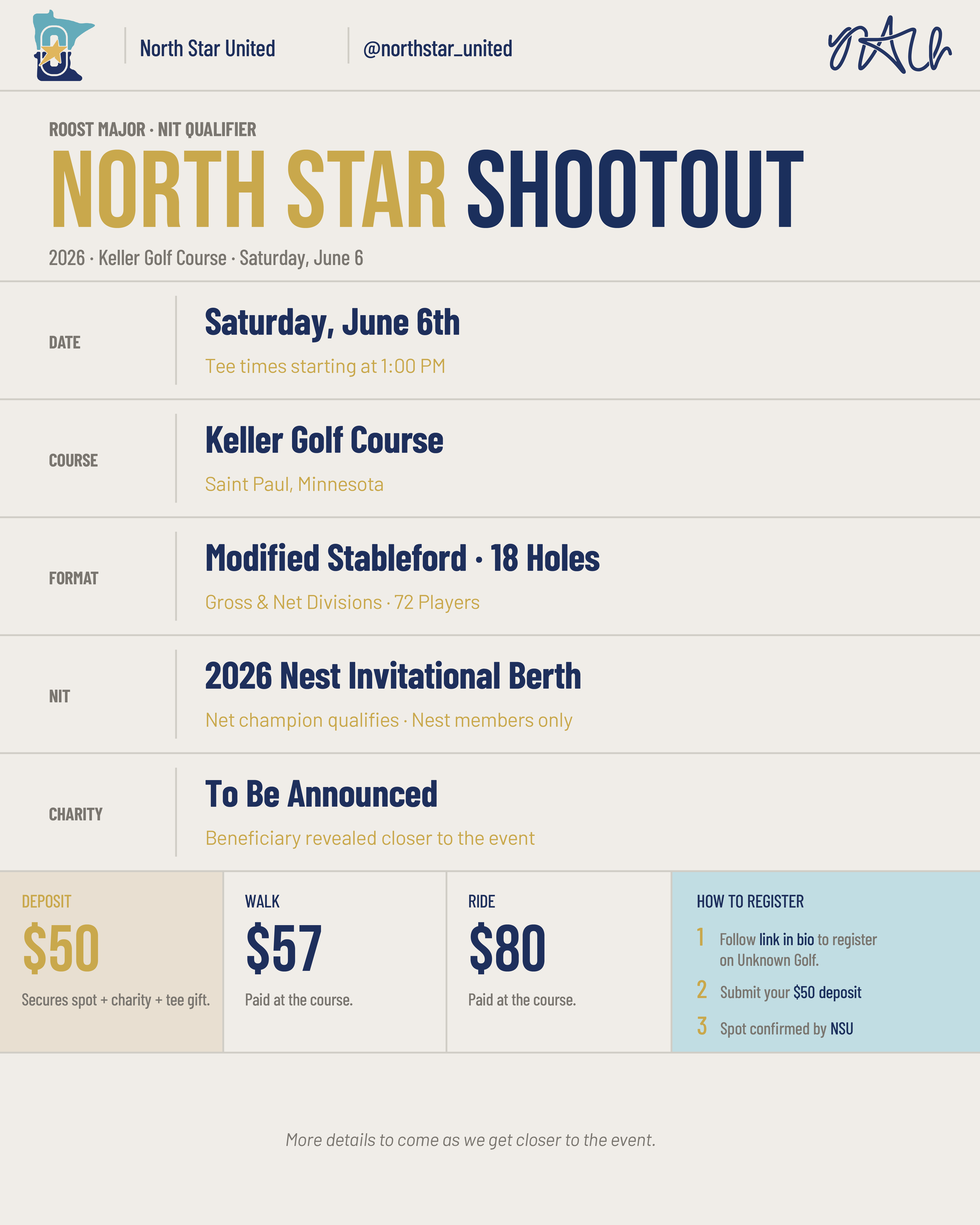 $50 deposit — secures your spot and includes the tee gift and charity contribution.