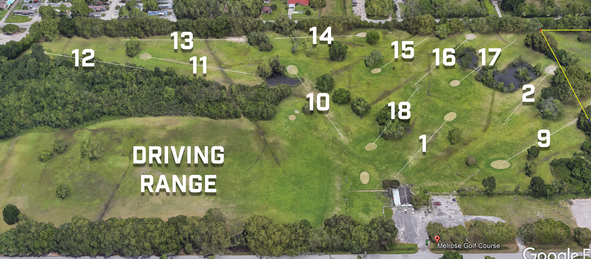 Reroute the existing holes to create a better flow or even eliminate 3 holes to make it a 9-hole course. This will allow people to get through a round in 1-1.5 hours. If you go the route of eliminating another 3 holes, you could sell off the area containing holes 11-13 for about $1.6m (~4.7 acres).