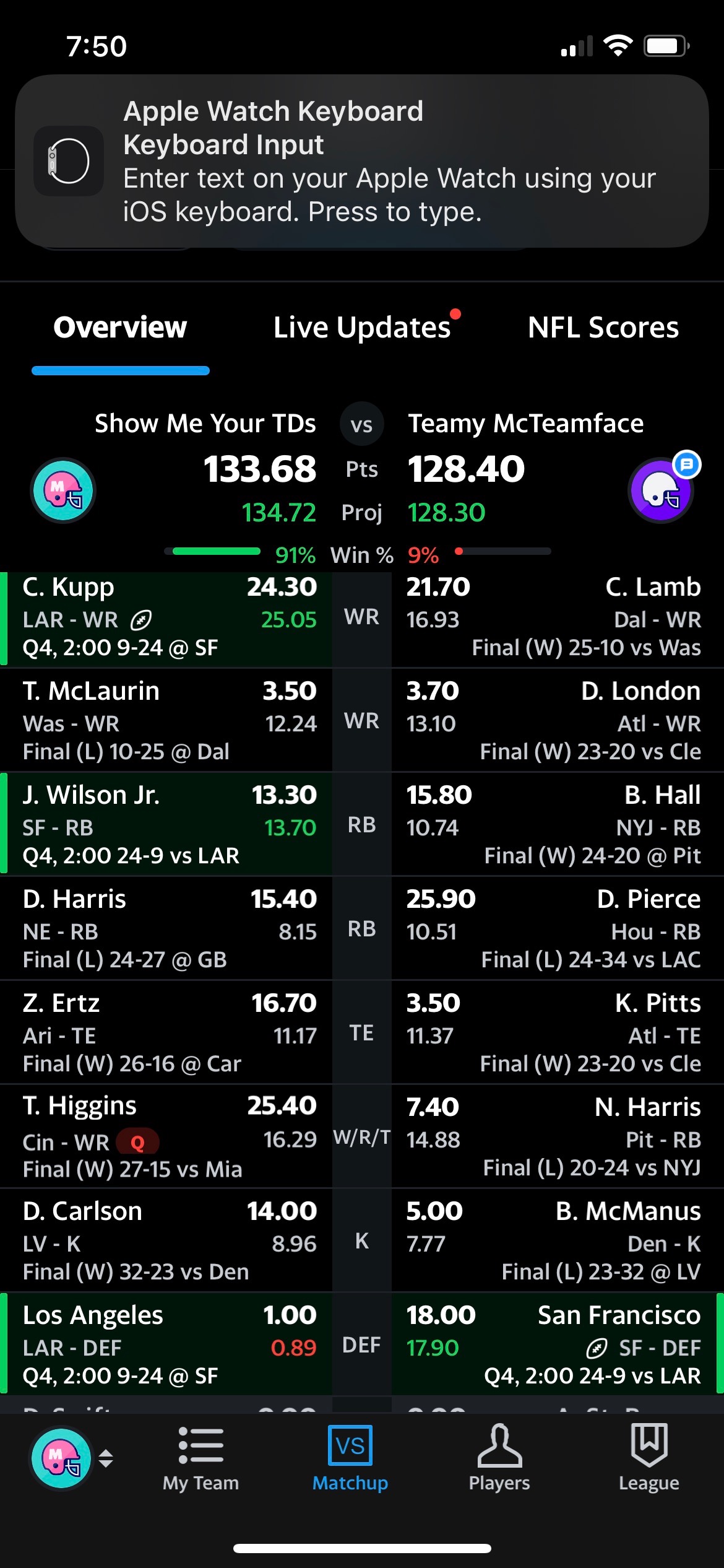 The wife is 2nd in the league in pts. She’s 1-2 coming into this week.