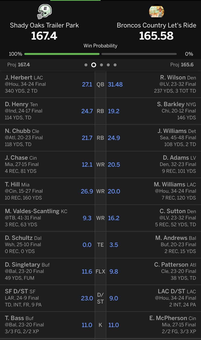 One of the 2 undefeated teams in my league just lost this week because of that late sack and fumble. They had a 21 point lead going into MNF and the other guy had SF D just put up 23 points. Unreal bad beat.