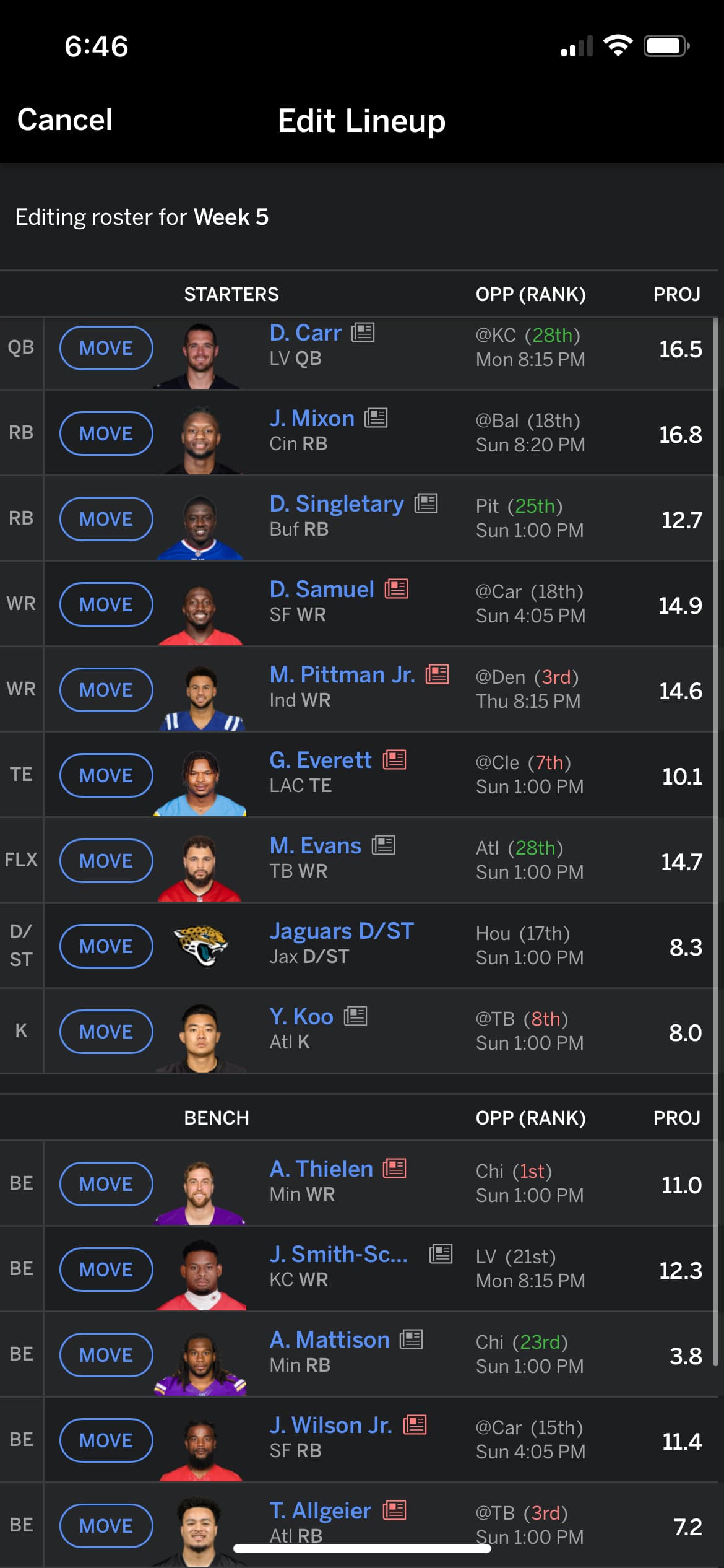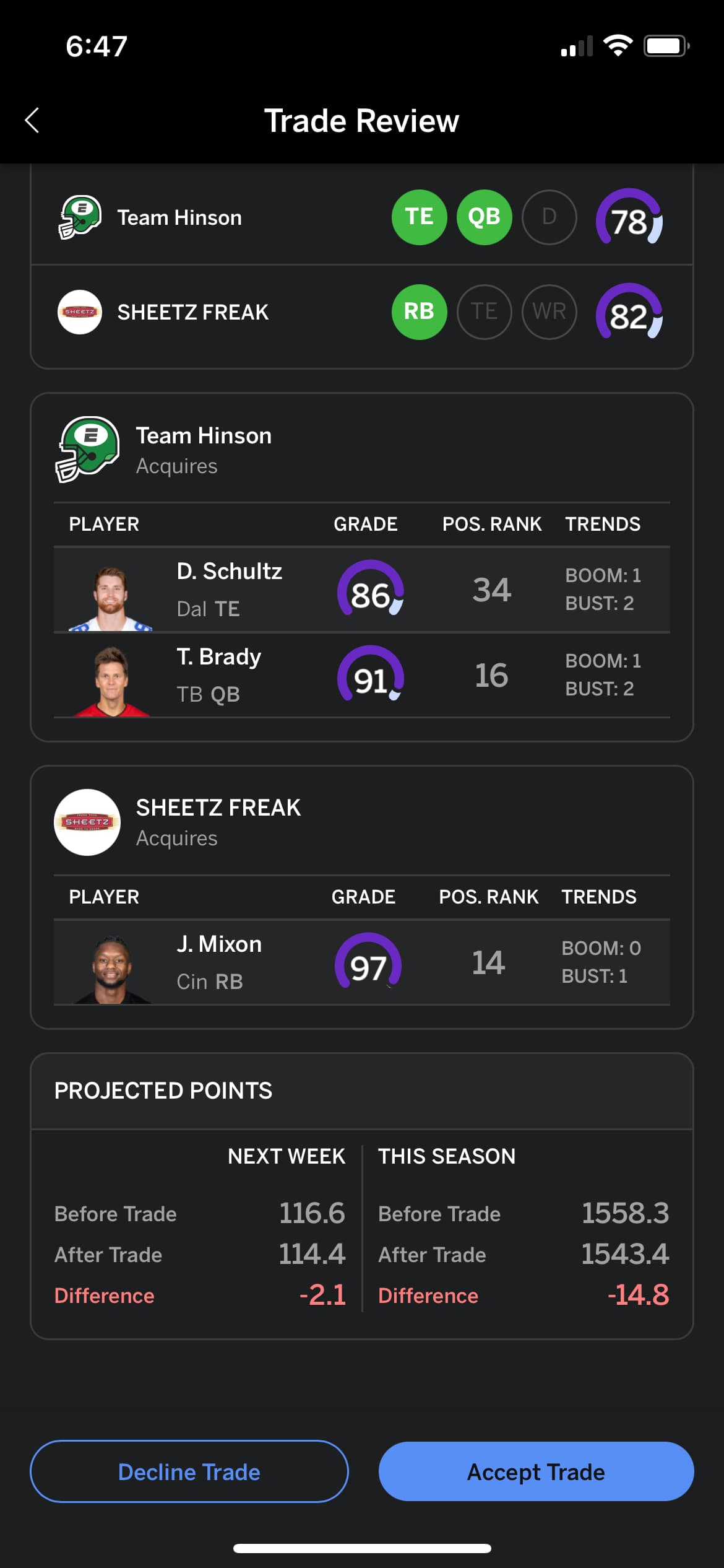 Is there no one on your waiver wire? Like, Goff would be better. Trevor Lawrence? Maybe snag Pickett and pray? But you’re fine at TE and you could get a Brady level QB for a lot less than Mixon