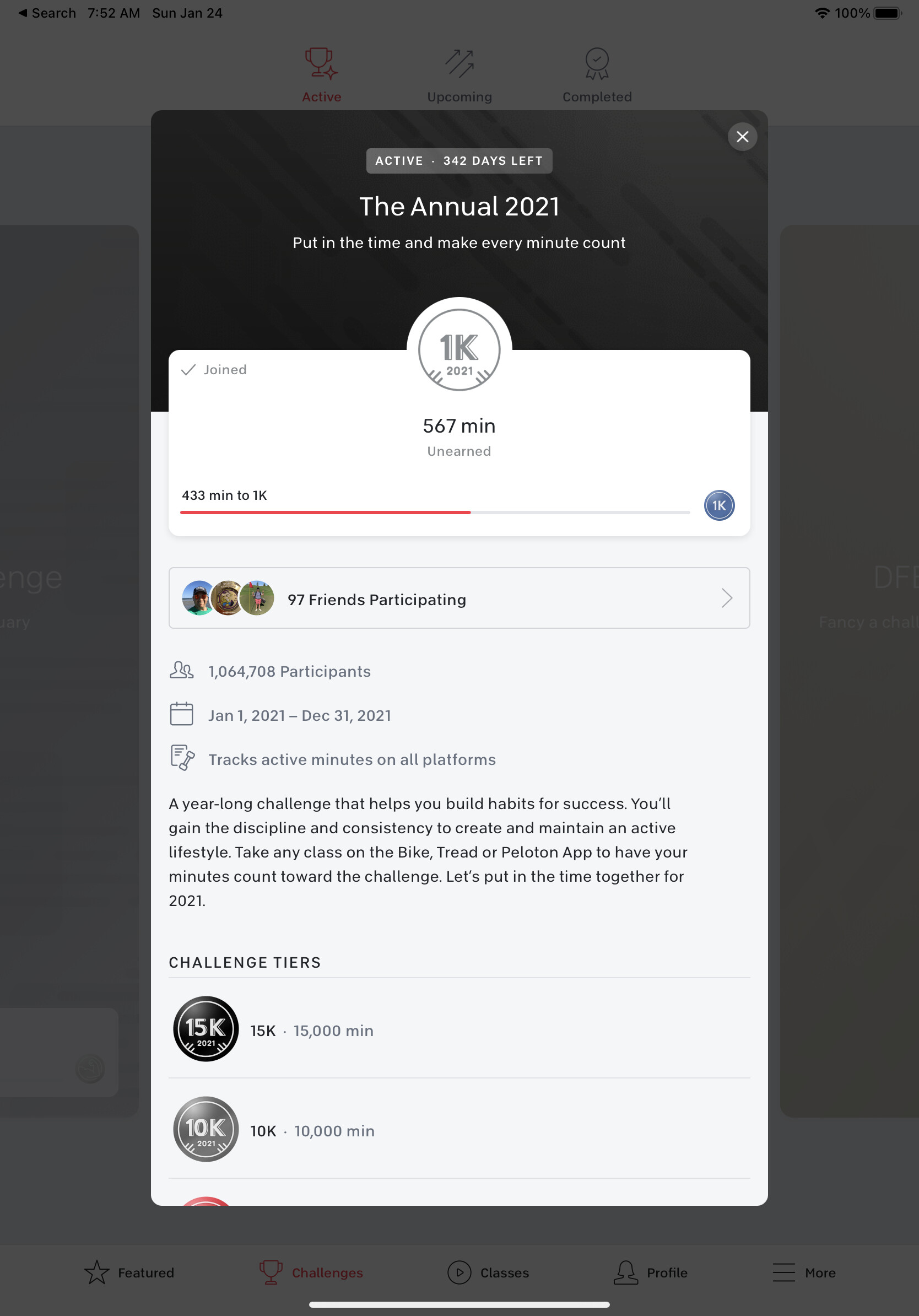 In the challenges tab, sign up for “The Annual” and there’s a badge for every interval of 1000 minutes.