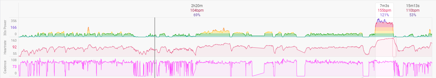Haven’t been on the Peloton as much the last couple weeks because it’s been too nice to be inside instead of outside. But I’ve still been power training even if it’s been outdoors. Saturday I rode for 2:30 where almost all of it was z2 but then on a stretch toward the end I put in a 7 minute z5/6 sufferfest. Based on the result from that, the site I use for analysis thinks my FTP is up, which is good since I’ll be testing soon. That little spike was 7 minutes at 121% of current FTP. It was a real gasser!