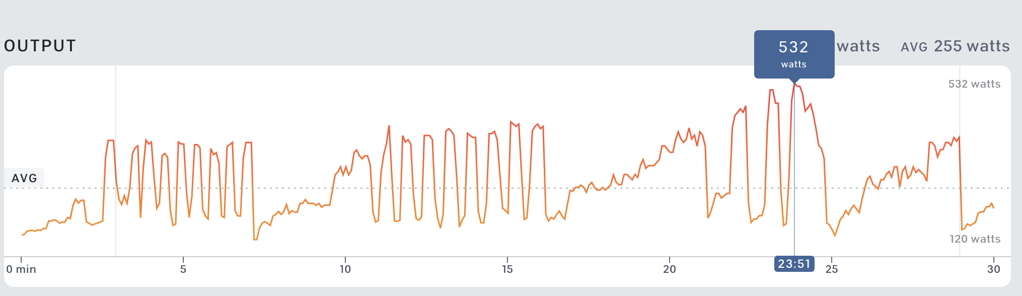 EDIT; forgot to include this yesterday. this is what petering out looks like. I think I hit my cardio wall and just couldn’t keep up the cadence. The intervals were short up to that point, and as per usual with Emma the last effort is the hardest one and I was gassed. You can see the output steadily declining because my cadence was dropping, resistance was steady at 70. There was only ~15sec recovery from the last interval instead of 30, and the effort went for a full 1:00 instead of 30sec and I couldn’t sustain that 500 watt pace, my biggest of the ride, for that long.