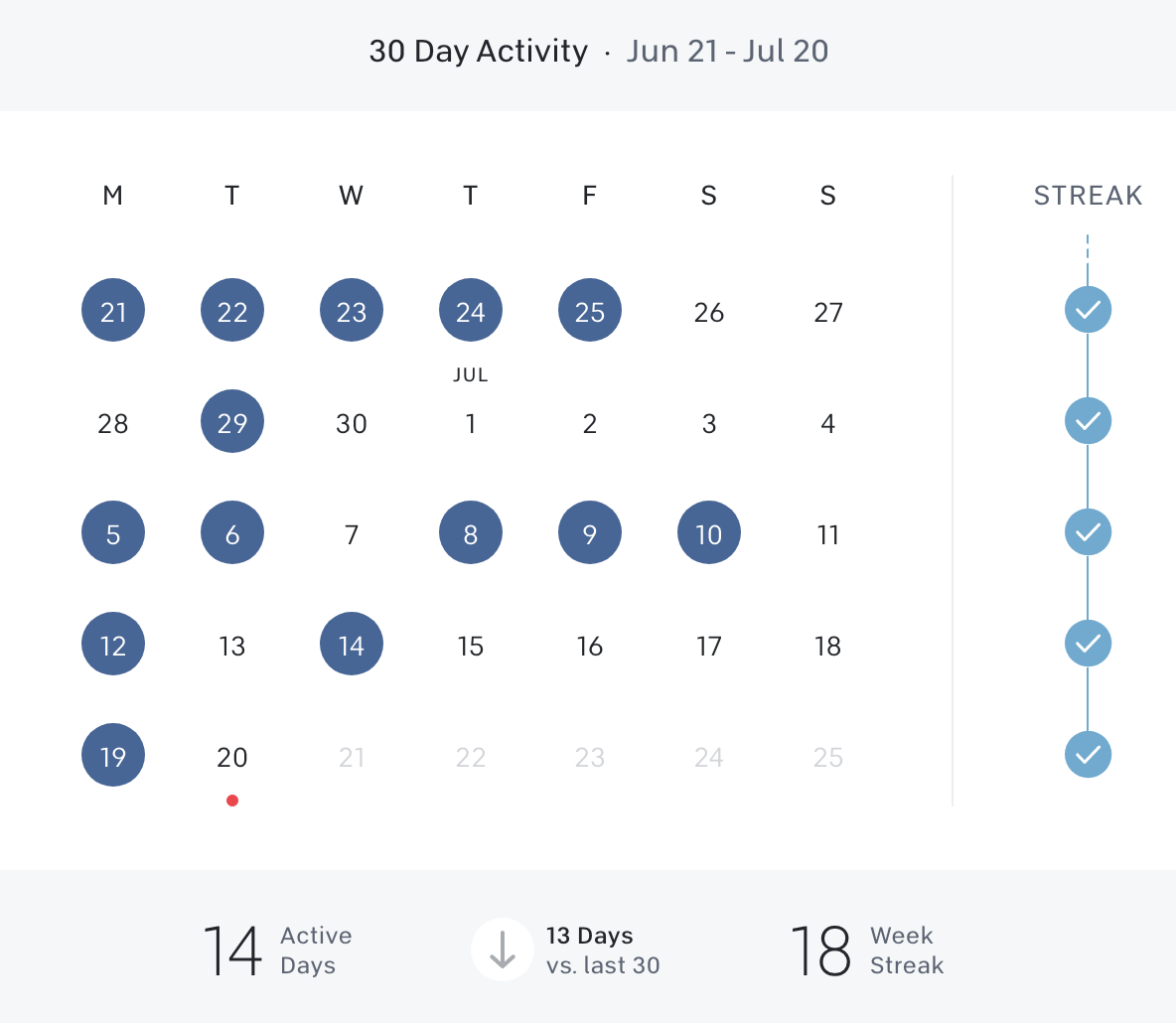 add me to the list of people whose activity has dropped significantly. Golf and traveling to see family being the big reason. However, typically during the summer I stop all workout activity outside of golf and yard work, which hasn’t been the case this year and I still have my weekly streak going.
