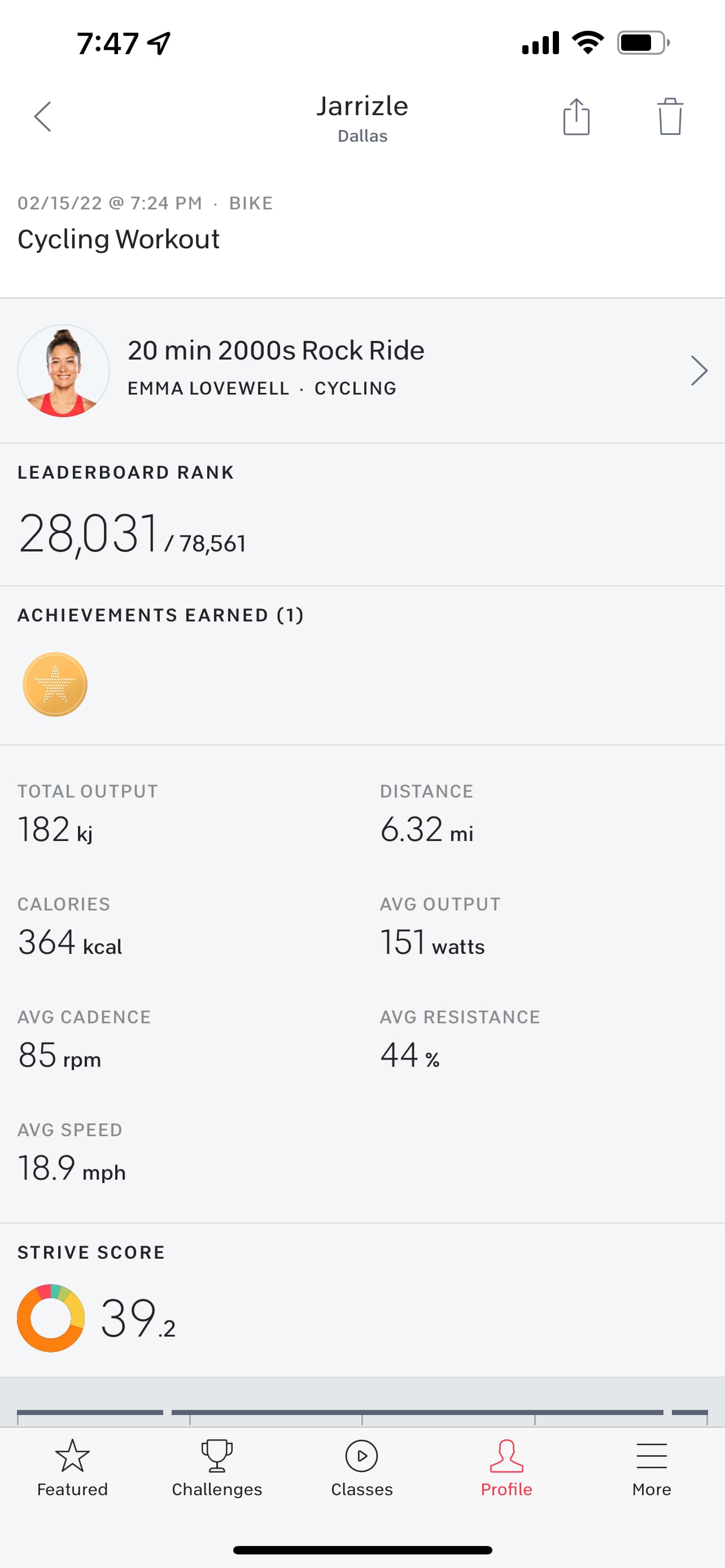 Nice 20 min PR tonight after coming down from a stomach bug all weekend. Emma is my favorite instructor by far. Love her music and classes overall.
