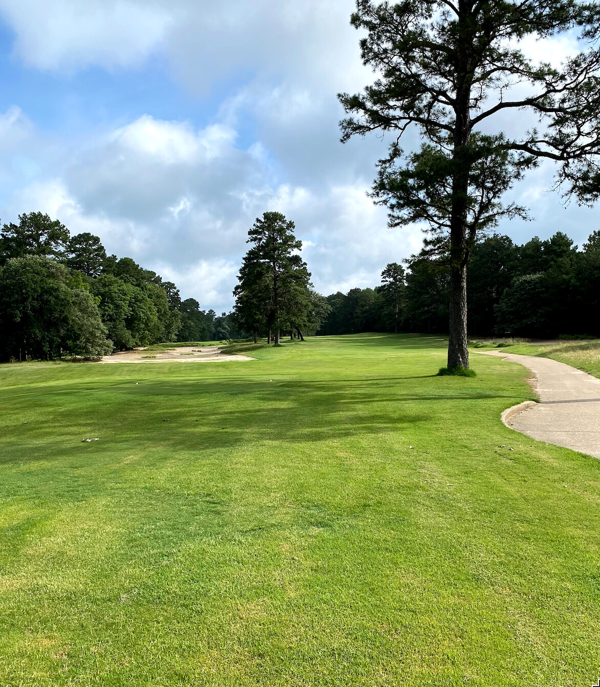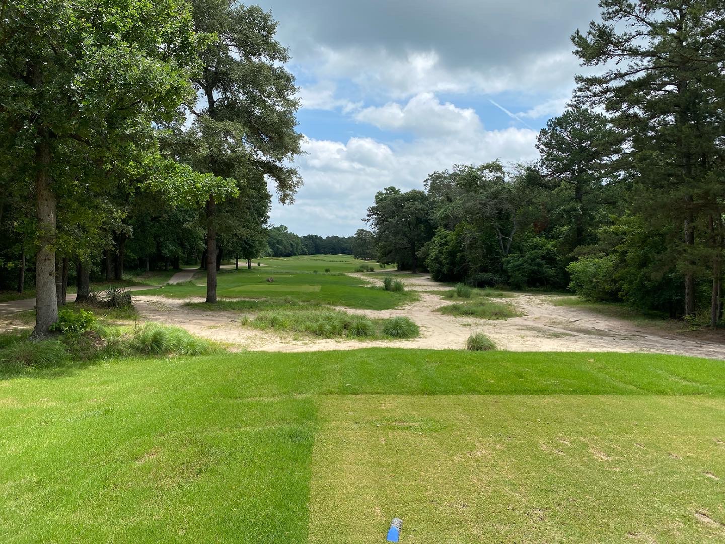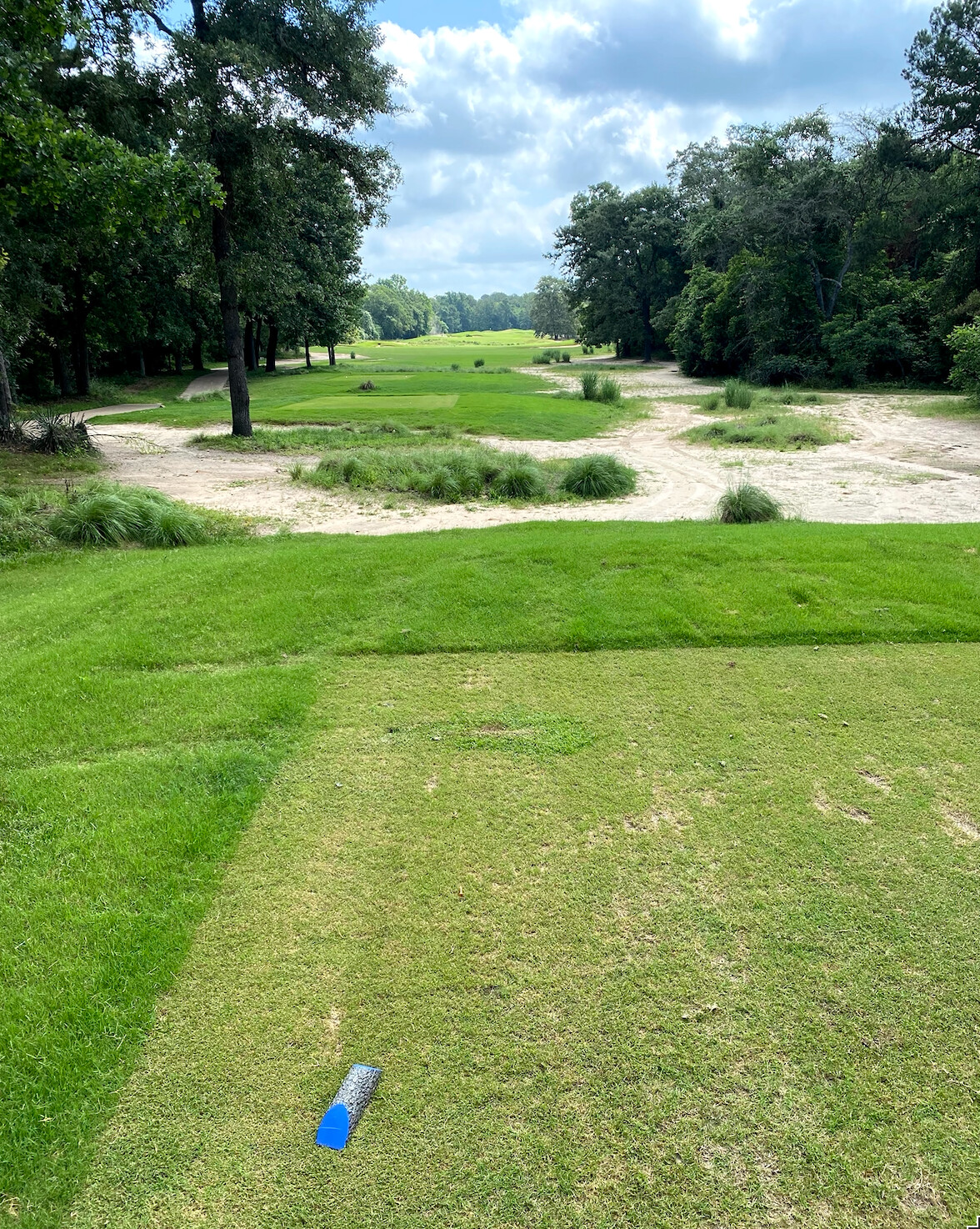 Really fun split fairway par-5 on the front. A good drive over the junk from the blues will clear it if you carry it 240+ I’d guess. If you do, you’ll likely have sub 200 in and it’s by far the better angle than going out right. Should make for a fantastic match play hole.