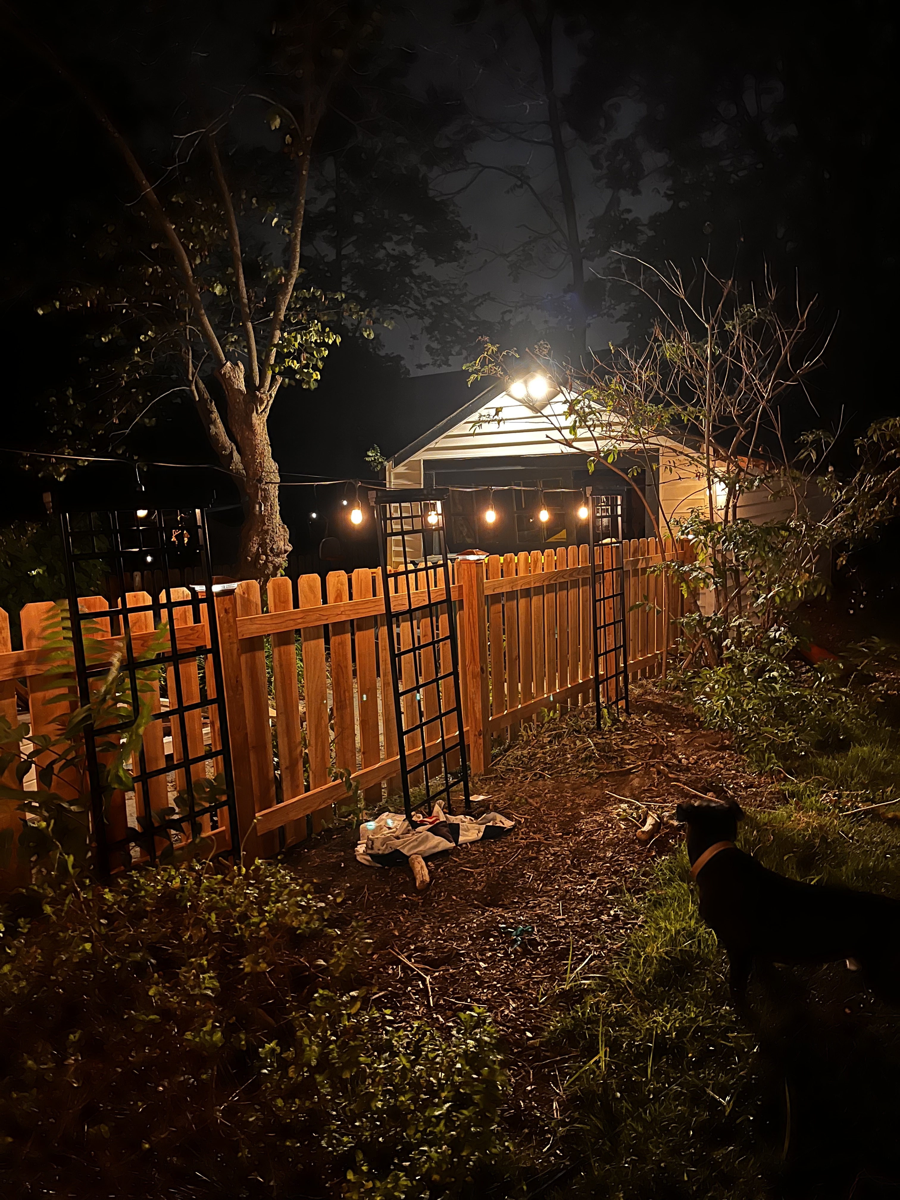 One half is totally done and the first two posts of the right half have been set, the next two pulled. If the rain holds off we will do another gate and pickets tomorrow