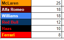 @Jrembold and McLaren continues the run of domination with another W, but Alfa Romeo and Williams arenāt that far behind. Strong start for Williams after a disappointing last season.