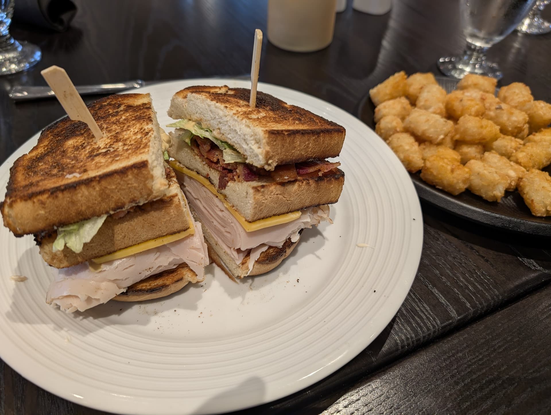 The good: $15 in this economy at a country club. Very, very happy with the amount of turkey. And also very happy that I didn’t have to request no ham as there’s none of that garbage meat by default. Based on the turkey, I would have appreciated another slice or two of cheese. Bacon was crispy and delicious. And to top it all off… devine tater tots on the side.