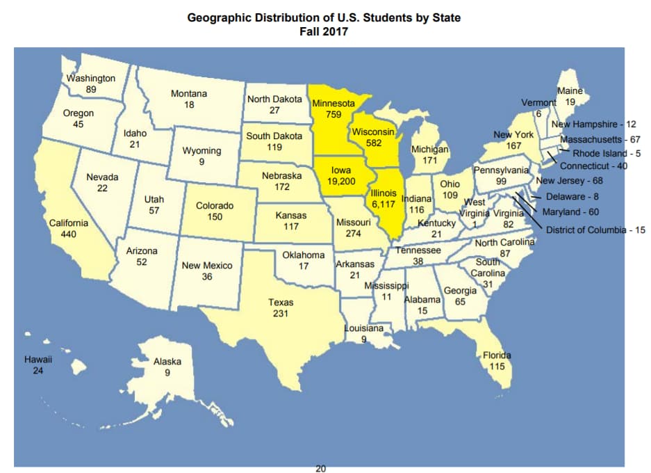 Here’s the 2017 data of the student body. You’re either from IC, Des Moines, Quad Cities, or the Chicago Burbs: