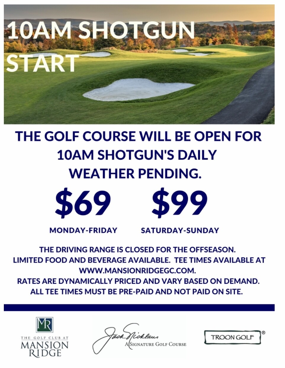 I unwittingly participated in the 10am shotgun at mansion ridge a couple weekends ago. Had to start on the 15th hole, made for a tough starting stretch. Pace of play was good all in all. We were the b group on 15 so had to let the group in front of us clear. guess they only do 10Am tee times for the winter. Nice course, was in good shape.