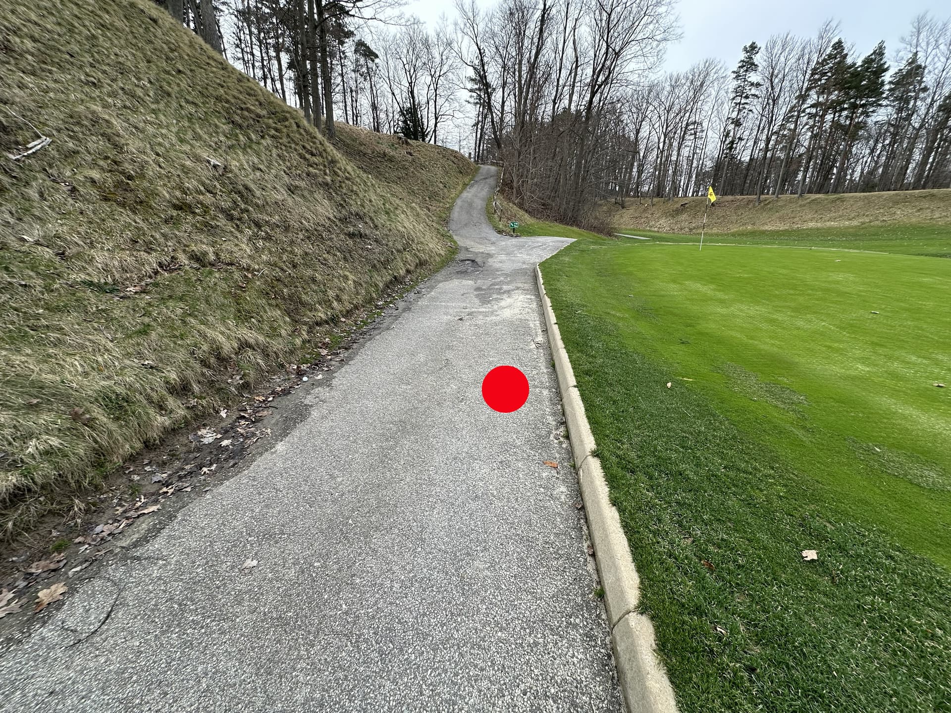 It could end up being that your āclosest reliefā going up, and keeping that arc, would be further away from the hillside behind the cart path. That case your closest relief, no closer to the hole, is on a 60-70 degree slope. Fine design, bad cart path, worse curb. It would be cool if you could actually still use the hillside as a kicker, even if it was down into a bunker or thick rough.