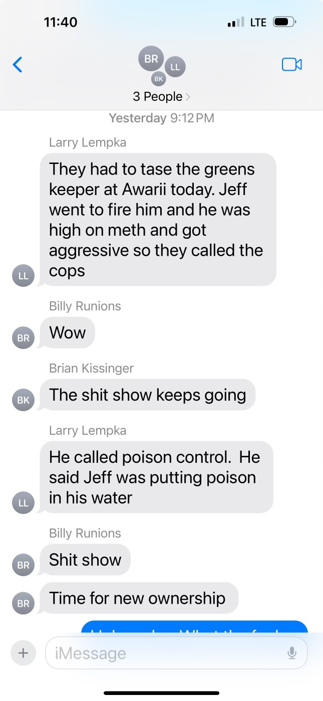 Heard that the greens keeper and the owner were trying to poison each others water or something. The owner called the police on the greens keeper cause he was tweaked out. And then it came to be that the owner was trying to poison the keeper lol.
