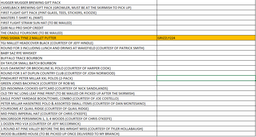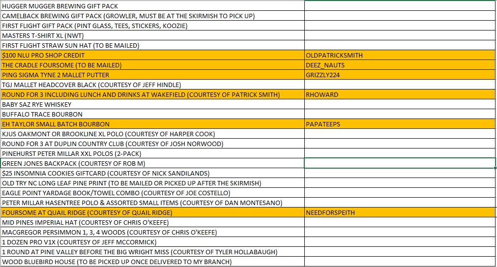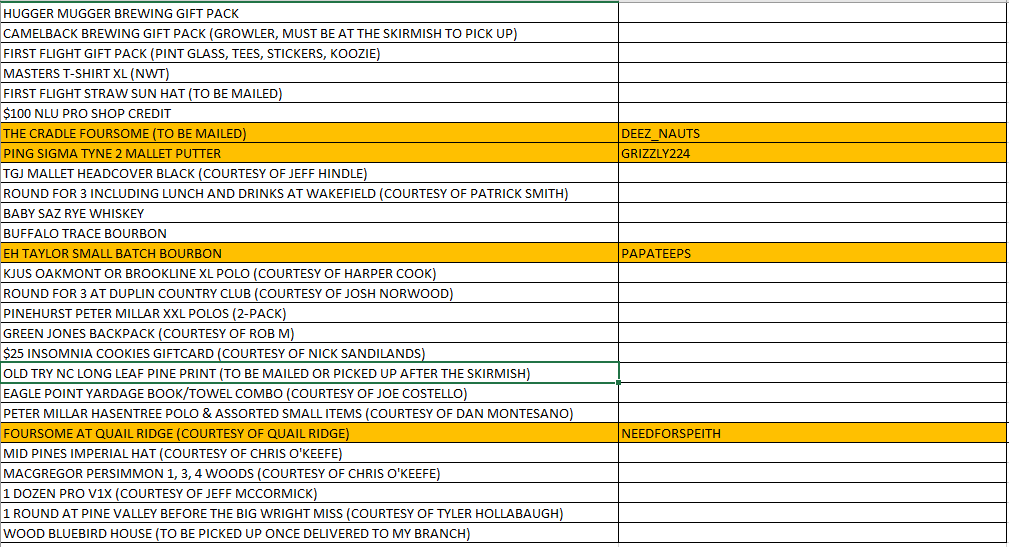 We are doing a charity raffle for the Skyway Skirmish @FirstFlight Major this weekend. The raffle drawing will start on Friday at 2pm. I’ll post the video of the wheel of names and you’ll have 20 minutes to pick your prize. After the 20 minutes I’ll spin for another name. If you miss your 20 minute window you can pick after the next person is drawn and picks.