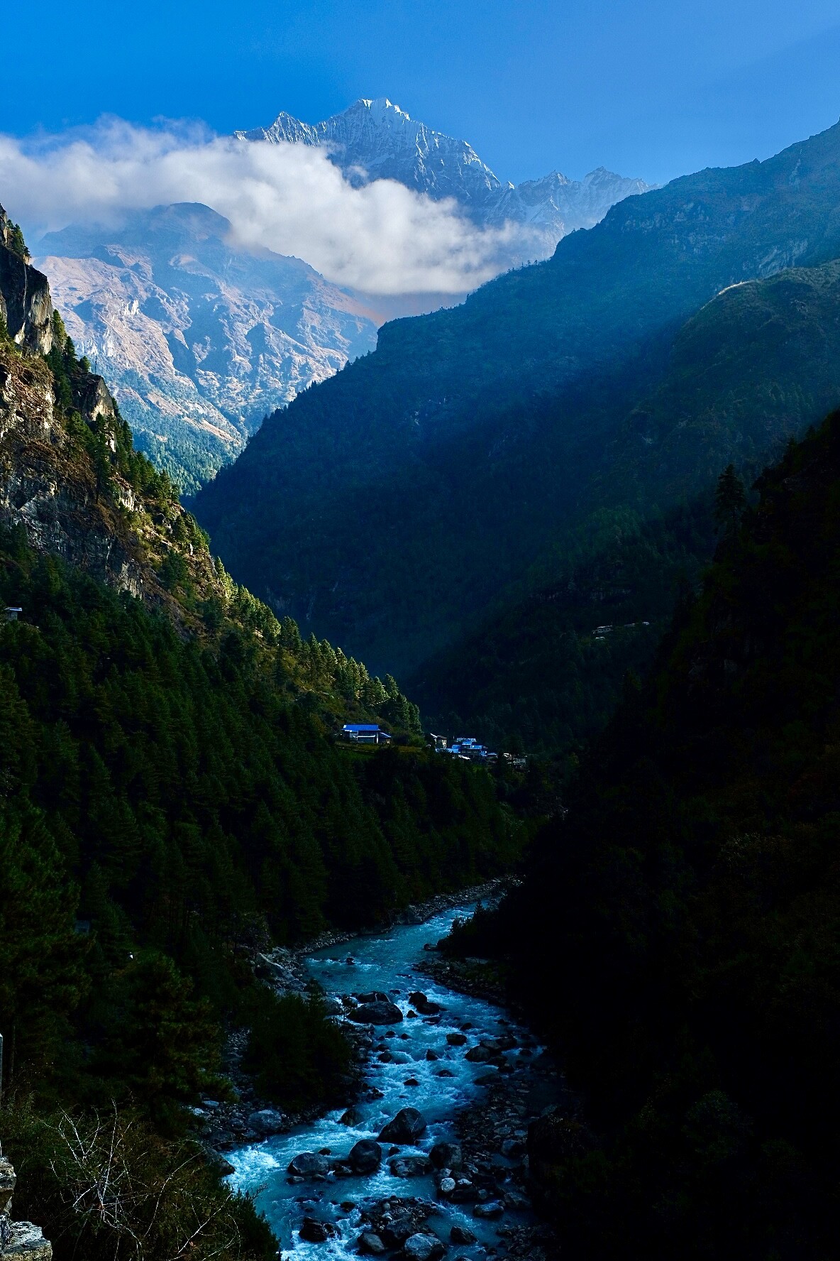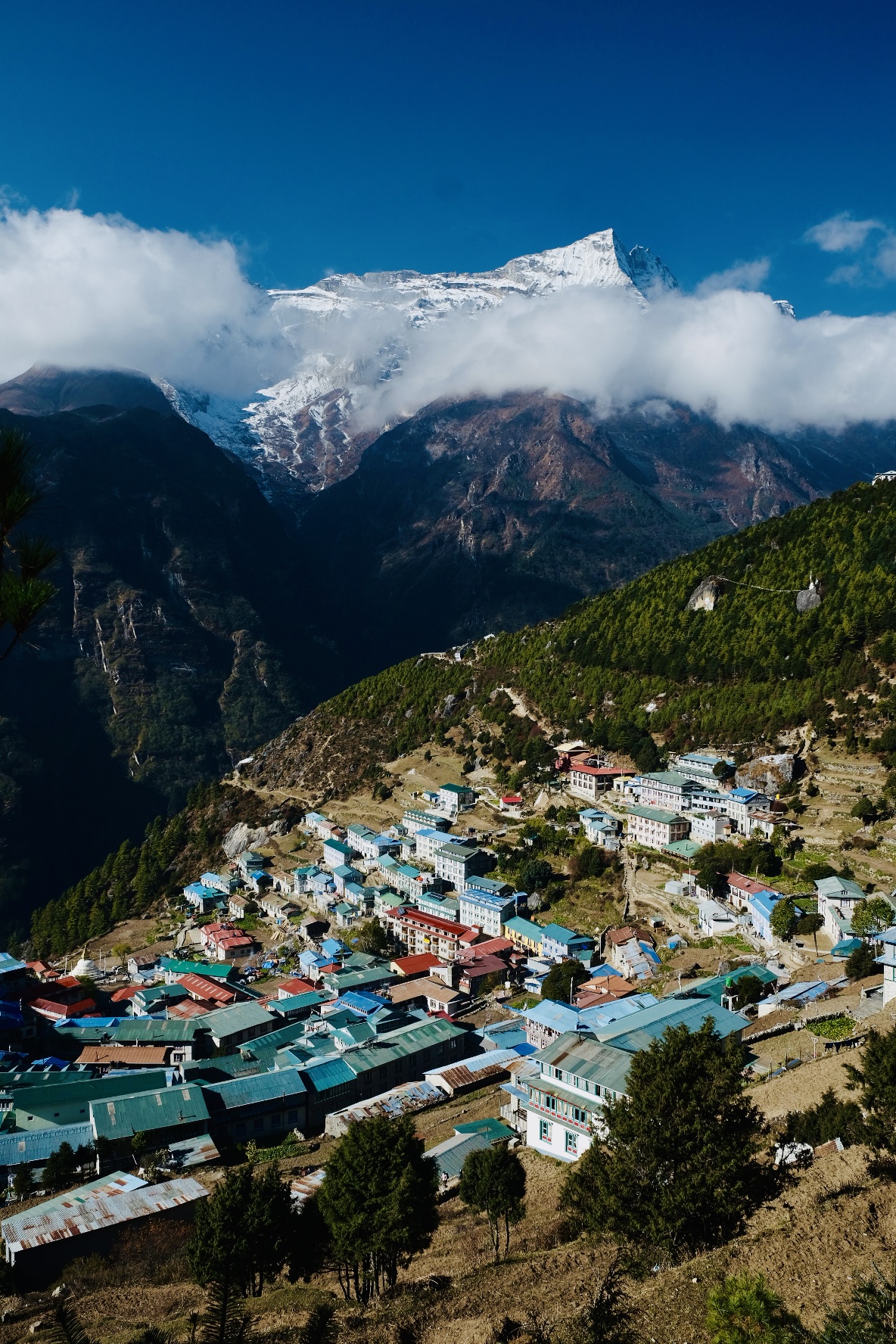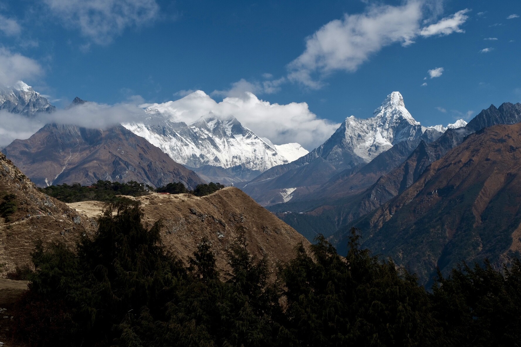 What I can’t get over is the scale of the landscape. We were hiking along the valley floor and I caught a glimpse of a peak which I thought was pretty impressive (since it would have been 5000m easily) and I asked Dil, our guide, what the name of the mountain was. He said “No mountain. Hill.”. A few moments later, we turned a corner and saw the peak below (Kangtega, 6,782m) behind the “Hill” and he said “That’s a mountain.” reminiscent of that famous scene in Crocodile Dundee.