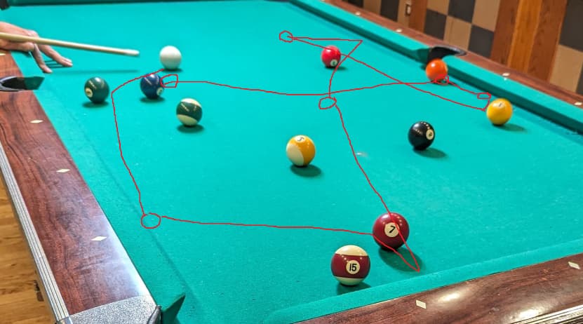 Apologies for the terrible drawing, but here’s a setup from last night that we spent 10 minutes going through. 3 and 4 up top, 5 and 7 bottom right. 8 ball lower left with 15 by it. Cue is the silver in the middle.