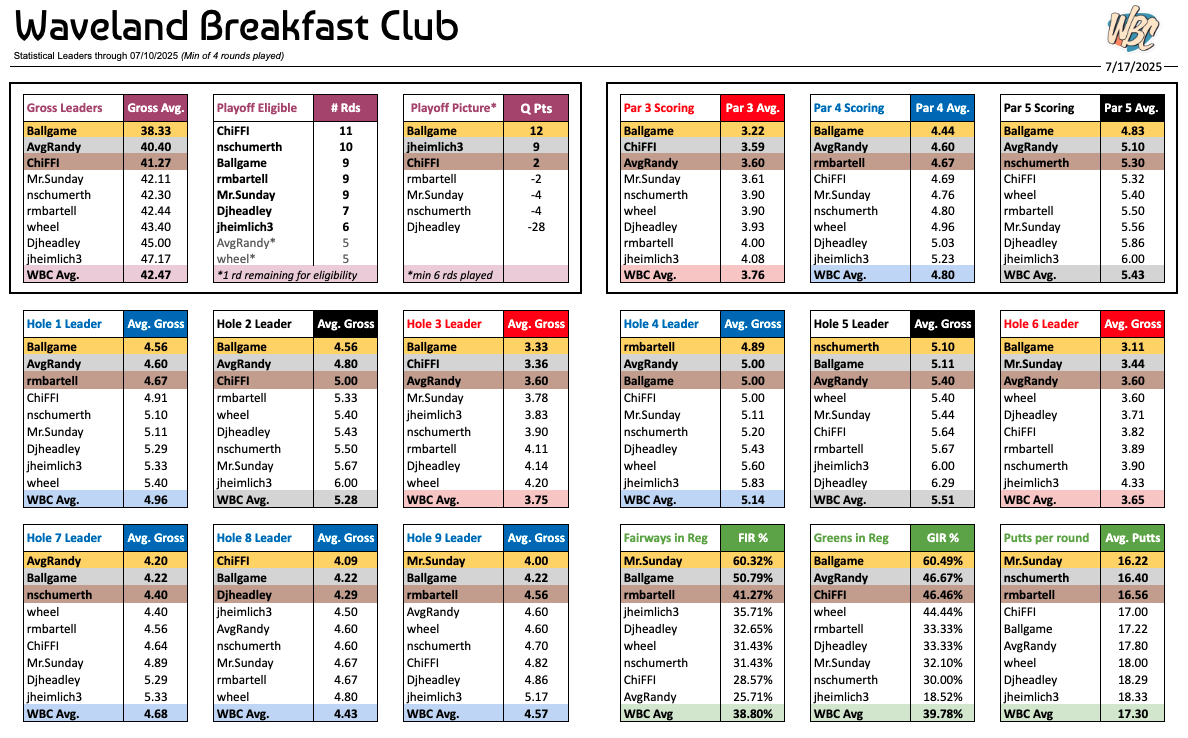 Contenders @Mr.Sunday & @nschumerth are making a charge up the leaderboard after posting BIG scores combining for 8 birdies over the last two weeks. Their group-mate and witness to the great 'bird-bath of 2025, @rmbartell, finally snapped his WBC leading ‘consecutive rounds without beating quota’ streak after hitting 7/9 GIRs from a season low 1/7 fairways (4/7 if we count ‘wrong’ fairways).