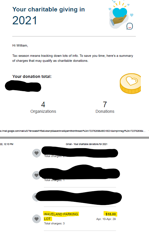 Very interesting summary of my charitable donations for the year…didn’t know I’d be getting a tax receipt for the three times I paid to park at Breakfast Ball before realizing it was a total waste.
